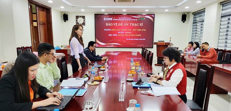 Khoa Thông tin - Thư viện là đơn vị đầu tiên được Nhà trường lựa chọn triển khai thí điểm thực hiện quy trình này, với hình thức tổ chức bảo vệ tập trung tại khối phòng Nhà E. Việc bố trí không gian bảo vệ tập trung, đồng bộ về cơ sở vật chất và kỹ thuật nhằm bảo đảm tính trang trọng, chuyên nghiệp, đồng thời tạo thuận lợi cho học viên trong quá trình bảo vệ luận văn.