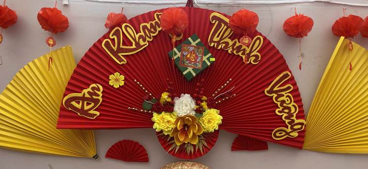 Những chiếc quạt giấy trang trí được thiết kế công phu với hình ảnh hoa mai, hoa đào, bánh chưng, câu chữ thư pháp như “Xuân”, “Lộc”, “An”, “Phúc” gợi nhắc đến hình ảnh Tết xưa trong mỗi gia đình. Quạt không chỉ là vật trang trí, mà còn là biểu tượng của sự thanh nhã, nền nếp và thẩm mỹ Á Đông.